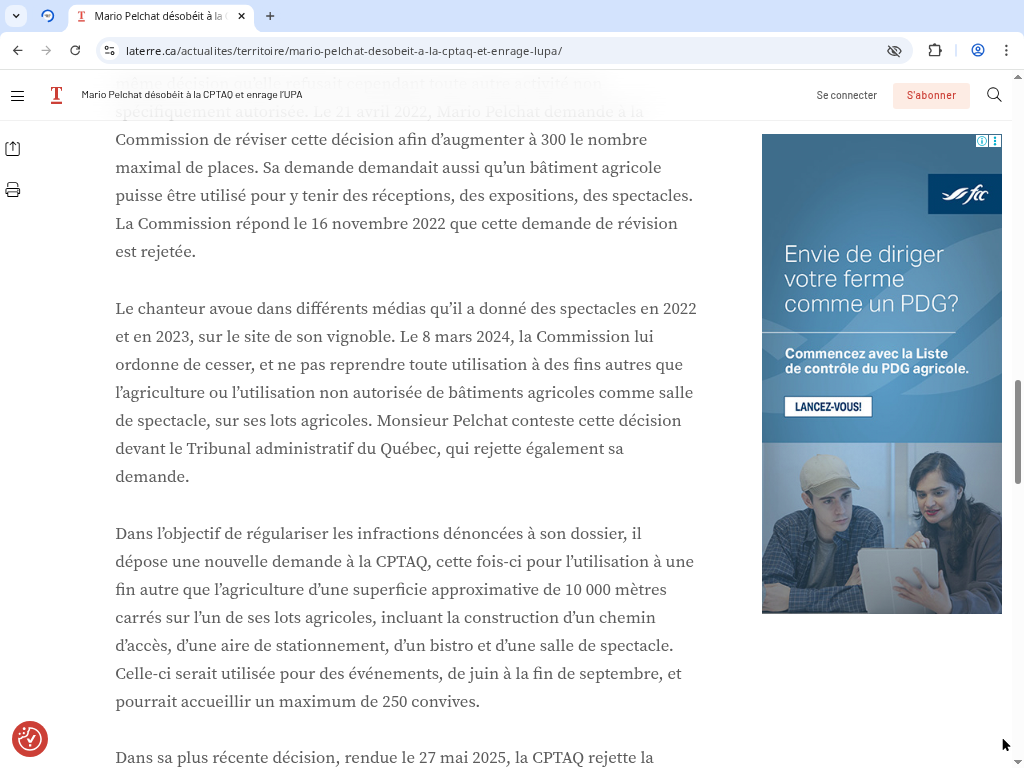 Depuis 2007, le chanteur québécois Mario Pelchat et sa conjointe Claire Lemaître‑Auger ont investi temps et argent pour créer un vignoble-chanteur à Saint‑Joseph‑du‑Lac. Ils voulaient allier vin, musique et art de vivre. Mais en 2024, leur projet se heurte à un mur : la Commission de protection du territoire agricole du Québec (CPTAQ) juge leurs activités non conformes à la Loi sur la protection du territoire et des activités agricoles. L’histoire qui suit illustre à quel point la course d’obstacles réglementaire peut freiner des entrepreneurs pourtant porteurs de projets culturels et économiques.