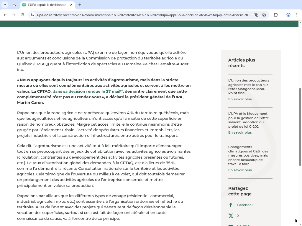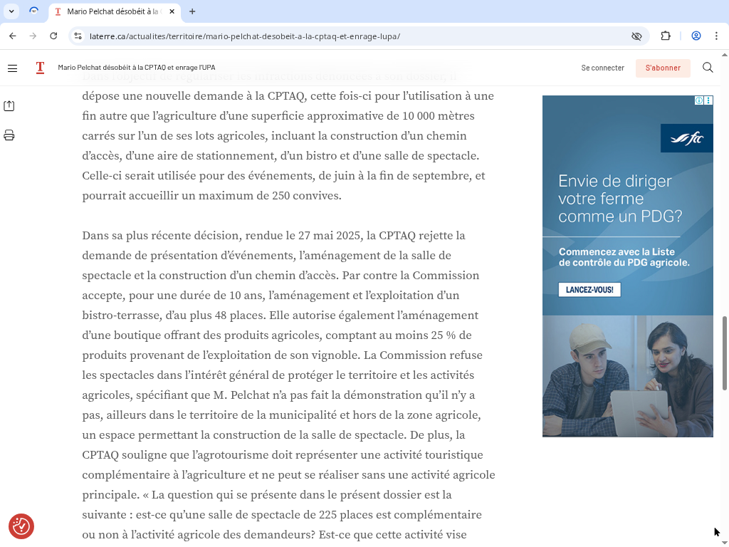 La question de fond reste légitime : comment protéger la zone agricole tout en permettant l’émergence de projets d’agrotourisme? L’UPA rappelle avec raison que nos terres cultivables sont limitées et vulnérables aux dérives. Mais l’agrotourisme, lorsqu’il est véritablement complémentaire, constitue un outil de diversification pour les agriculteurs et un moteur économique local. Le défi consiste à établir des règles claires et à les appliquer avec discernement, en tenant compte des réalités entrepreneuriales. Le cas du vignoble de Mario Pelchat aura au moins servi à ouvrir ce débat essentiel.